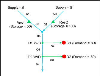 The second example is identical to the first, except that the two reservoirs are on different rivers. The river headflow is insufficient to meet the two demands. Therefore, the reservoirs will need to release water to satisfy the demands. Both reservoirs have a top of conservation pool (TOC) of 200, although their initial storages are different: 50 and 100, as shown. Both reservoirs have the same demand priority (99). Therefore, after allocating water, the goal will be to have both reservoirs finish with the same fraction of the top of conservation pool filled.